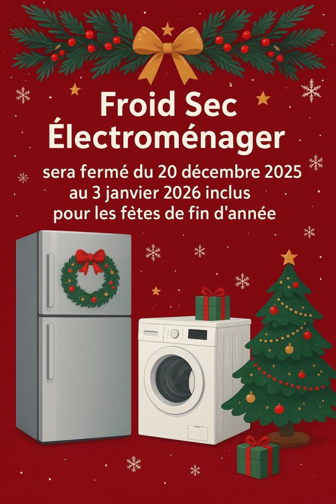 L’équipe Froid Sec Électroménager à La Réunion vous informe que notre entreprise sera fermée du 20 décembre 2025 au 3 janvier 2026 inclus pour les fêtes de fin d’année.