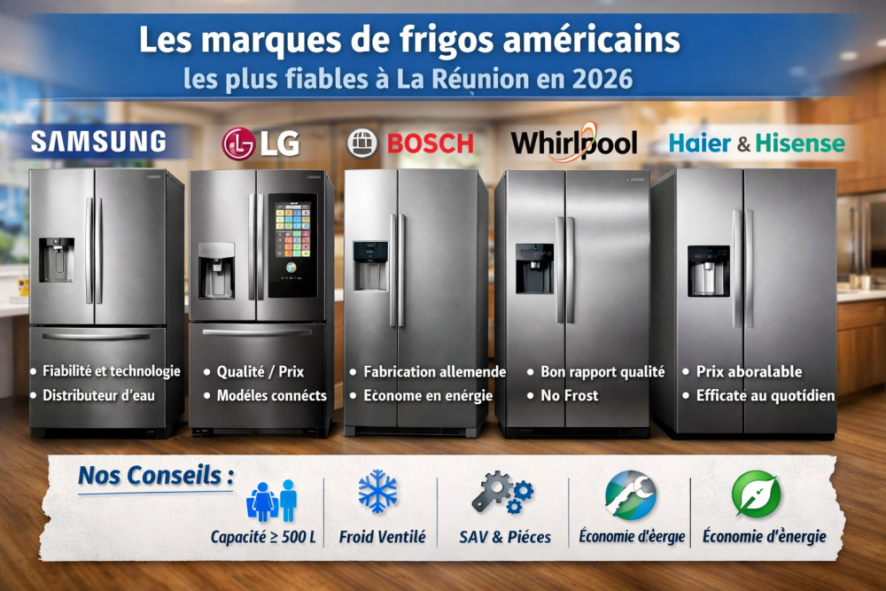 Découvrez les frigos américains les plus fiables à La Réunion en 2026. Samsung, LG, Bosch, Whirlpool, Hisense et Haier : conseils pour bien choisir et prolonger la durée de vie de votre réfrigérateur.