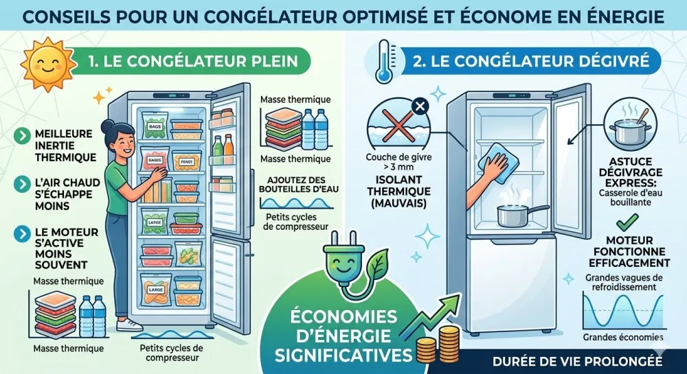 L'astuce Froid Sec : Si votre congélateur est trop grand, comblez les espaces vides avec des bouteilles d'eau remplies aux 3/4. Ces "blocs de glace" stabilisent la température et soulagent le compresseur.