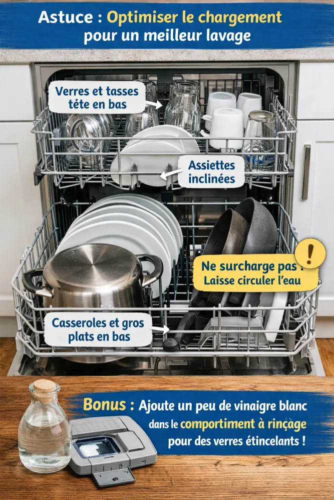 Les Couverts : Si vous avez un panier, placez les manches vers le bas. Mélangez les types de couverts pour éviter qu'ils ne "s'emboîtent" (ce qui empêche l'eau de passer).